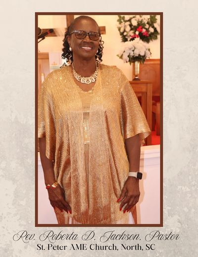 For the past eight years, Rev. Jackson has been actively preaching and sharing the Word of God. She has delivered sermons at St. Stephen AME Church in Fort Motte, SC, and Mt. Zion AME Church in Elloree, SC. Currently, she serves as the pastor of St. Peter AME Church in North, SC.
